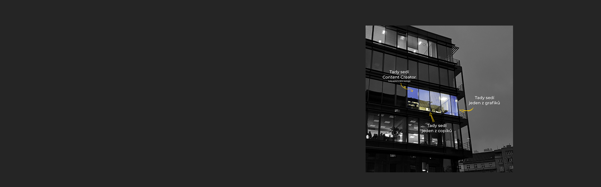 Práce je on site – žádný digitální poustevník, chceme vás vidět mezi námi! Kanceláře máme v Holešovicích a počítejte, že bychom vás potřebovali na full time a klidně co nejdřív. Sršíte nápady a umíte je proměnit v kvalitní výstupy? U nás dostanete prostor tvořit a když vám vše půjde, budete mít pod kontrolou celou kampaň. Žádný nápad u nás není dostatečně šílený, abychom se o jeho realizaci nemohli pobavit. Důležité pro nás je, zda máte přesah, chápete kontext a sledujete trendy. Zašlete nám svoje CV a portfolio a třeba se uvidíme na pohovoru.